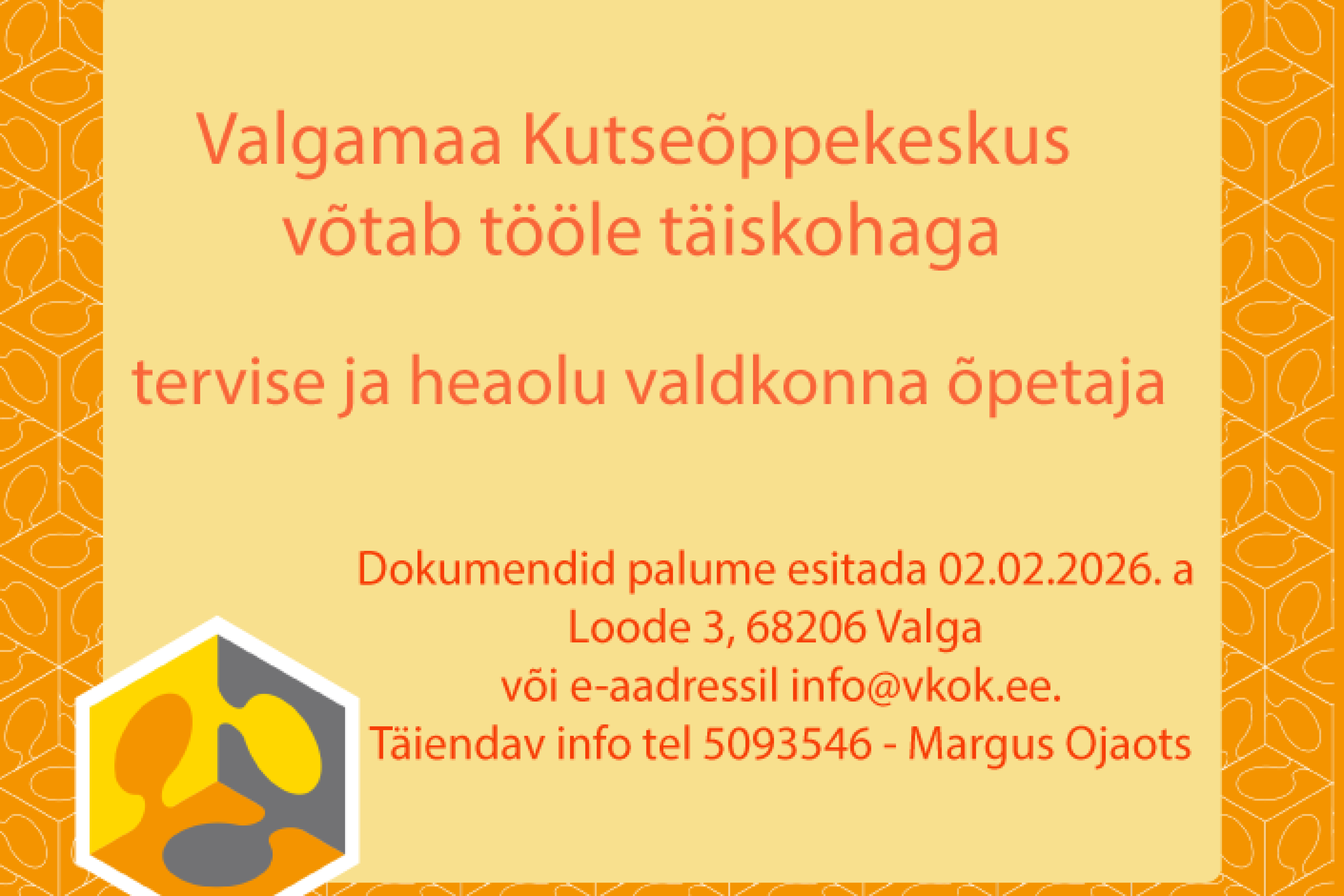 Dokumendid palume esitada 02.02.2026. a Loode 3, 68206 Valga või e-aadressil info@vkok.eelink opens on new page.