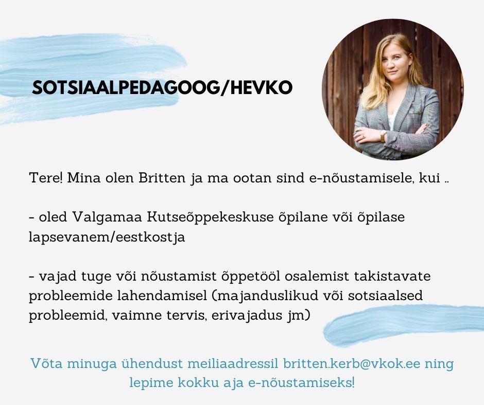Sotsiaalpedagoogilist tuge pakub Britten Kerb e-nõustamisena igal kolmapäeval 10:00-16:00.